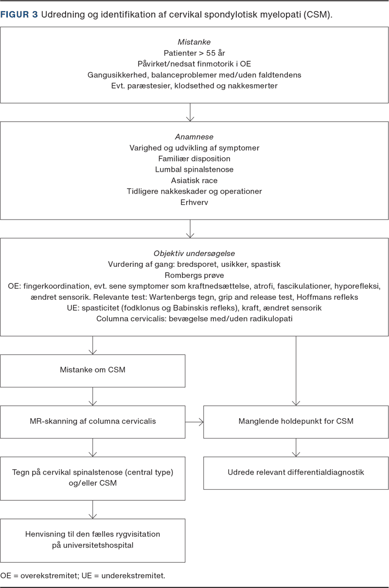 Cervikal spondylotisk myelopati (CSM) er en hyppigt forekommende progressiv tilstand, der er kendetegnet ved aldersrelaterede degenerative forandringer i columna cervicalis, hvilket resulterer i gradvist ophævet liquorflow og efterfølgende kompression af rygmarven og/eller de omgivende blodkar [1, 2]. Kompressionen opstår med baggrund i den spondylotiske ryg med degenerative forandringer omkring diskus, vertebra, facetled og ligamenter medførende nedsat plads i spinalkanalen (Figur 1) [2, 3].