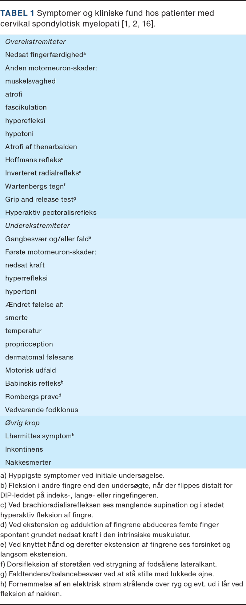 På baggrund af varierende grad af kompression af rygmarven og nerverødderne kan patienter med CSM fremstå med et bredt spænd af symptomer og kliniske fund (Tabel 1) [17].
