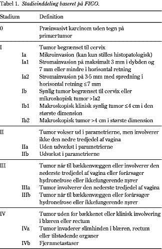 Når den histopatologiske diagnose foreligger, bør der foretages stadieinddeling i henhold til retningslinjerne fra Fédération International Gynécologie et Obstétrique (FIGO) (Tabel 1 ). Stadieinddelingen er klinisk. Patienten skal undersøges i narkose med bimanuel rektovaginal eksploration. Der skal endvidere udføres cystoskopi med biopsi fra suspekte områder. Endvidere bør der foretages i.v.-urografi eller anden undersøgelse med henblik på nyrernes afløbsforhold, og endelig bør der foretages røntgen af thorax med henblik på lungemetastaser. Den kliniske stadieinddeling tager ikke hensyn til eventuelle lymfeknudemetastaser, der har en væsentlig prognostisk betydning. Traditionelle billeddiagnostiske undersøgelser, fx UL-undersøgelser eller lymfografi, giver ikke valide oplysninger. MR-scanning og specielt PET kan muligvis anvendes i denne sammenhæng, men disse metoders diagnostiske potentiale er endnu uafklarede.