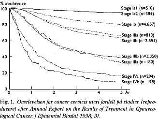 I Danmark er overlevelsen for patienter med cervixcancer ikke forskellig fra overlevelsen i de øvrige nordiske lande. For sygdomsgruppen som helhed er femårsoverlevelsen ca. 65%, men den faktiske overlevelse er naturligvis afhængig af stadiefordelingen (Fig. 1 ). Ved stadium I er femårsoverlevelsen ca. 80%, og den falder til ca. 60% ved stadium II. Ved stadium III er femårsoverlevelsen ca. 35%, og den er under 10% for stadium IV.