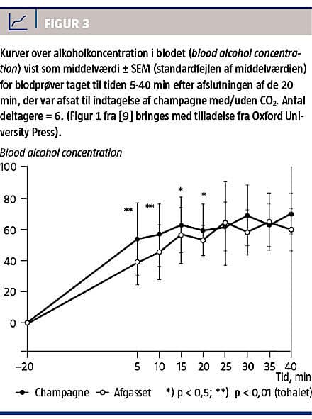 I 1824 gav Henderson den første, lægelige beskrivelse af champagnerusen: »The brisk wines of Champagne intoxicate very speedily, probably in consequence of the carbonic acid gas in which they abound, and the volatile state in which their alcohol is held; and the excitement is of a more lively and agreeable character and shorter duration, than that which is caused by any other species of wine, and the subsequent exhaustion less« [13]. Hypotesen om en hurtig boblerus fandt 100 år senere støtte i resultaterne fra Edkins et al’s eksperimenter med katte, hvor de fandt hurtigere optagelse af alkohol fra maveslimhinden ved tilstedeværelse af CO2 [14]. Først i 2003 blev effekten af champagnebobler studeret hos mennesker. Tolv mænd og kvinder tømte tre glas champagne i løbet af 20 minutter; en uge senere fik de samme ration, men først efter at CO2-boblerne var fjernet med en stavblender [9]. Promillen (blood alcohol concentration) fem minutter efter sidste slurk champagne var højere med bobler i glasset (0,52) end uden (0,40) (Figur 3). Arealet (mg × min/100 ml) under plasmakoncentrationstidskurven var signifikant forskellig i op til 20 minutter efter indtagelsen: 203,08 for champagne med CO2 versus 167,33 for afgasset champagne. Resultatet af en compensatory tracking test 20 minutter efter indtagelsen viste øget cerebral alkoholpåvirkning efter indtagelse af champagne med bobler (196,4 msek) end efter indtagelse af champagne uden bobler (46,3 msek).