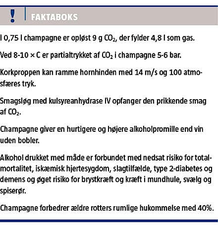The effervescence of champagne is due to 4.8 l of CO2-gas dissolved at a pressure of five bars. The velocity of an uncontrolled cork (60 km/h) may cause serious eye injuries. The fizz of champagne is mediated by carbonic anhydrase IV located in the membrane of sour-sensing cells. The association between alcohol intake, cardiovascular disease and all-cause mortality follows a J-shaped curve with the nadir at consumption levels of one drink/day. Polyphenols present in champagne increase spatial working memory in aged rodents and induce a neuroprotective effect against oxidative neuronal injury.