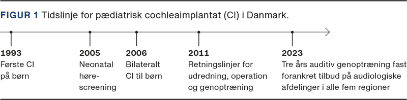 Neonatal hørescreening muliggjorde tidlig diagnostik og bidrog til at reducere implantationsalderen, men det ændrede ikke børnenes auditive og talesproglige udbytte signifikant [8]. På denne baggrund besluttede Sundhedsstyrelsen i 2012 i samråd med fagfolk og en patientorganisation at indføre retningslinjer for udredning, operation og genoptræning af børn med CI [1]. Dette var første tiltag fra sundhedssektoren i forhold til at tilbyde specifik auditiv og verbal træning til børn i det første år efter implantation.