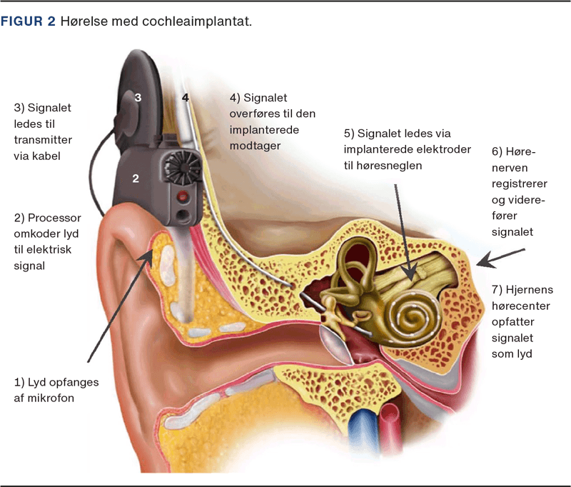 CI-implantation foretages i fuld bedøvelse med anvendelse af ansigtsnervemonitorering. Der anlægges et snit bag øret, hvorefter der foretages opboring af tindingebenet, dvs. en mastoidektomi. Mellemøret åbnes bagfra via mastoidektomien, hvorved man får adgang til det runde vindues niche. Det runde vindues membran skubbes til side, hvorefter elektroden indføres i cochlea gennem scala tympani. Implantatets hoveddel – modtageren – placeres i en udboret fordybning i kraniet over/bag øret. Der foretages perioperative målinger af impedans og neuralt respons på stimulation, idet sidstnævnte anvendes til estimering af indstilling af ydre processor ved første lydtilslutning. Risici involverer midlertidig ændring af smagssans samme side af tungen, dvs. i chorda tympani, midlertidig balanceusikkerhed/svimmelhed, hævelse/hæmatom og infektion samt i meget sjældne tilfælde midlertidig facialisparese. Hertil har implanterede en let øget forekomst af meningitis i forhold til normalbefolkningen (< 1 ‰), hvorfor alle tilrådes vaccineret mod pneumokokinfektion forud for operationen, som i øvrigt nu er blevet en del af det normale vaccinationsprogram [1]. I 2023 har omkring 1.000 børn gennemgået operationen, og totalt i Danmark er omkring 3.800 personer defineret som CI-brugere. Figur 2 demonstrerer hørelse med CI, og Figur 3 viser brug.