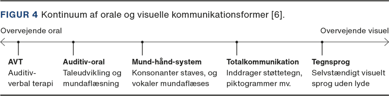 Børn med høretab og andre vanskeligheder udgør en særlig gruppe med en prævalens på omkring 25% af populationen [15, 18]. Andre vanskeligheder kan være cerebral parese, forskellige grader af autisme, kognitiv retardering, dyspraksi, dysleksi mv. [19]. Det er afgørende, at tilbud til denne gruppe målrettes hvert enkelt barn og familie. I et longitudinelt studie [18] fandt man, at denne gruppe børn udvikler sig langsommere, men at gruppen over en seksårig periode udviklede sig inden for sproglig norm (± 2 standardafvigelser) på både ordforråd, komplekst sprog og talediskrimination i støj over tid [19]. Det er derfor afgørende, at gruppen tilbydes træning af den auditive sans og en individuel vurdering af mulighederne for udvikling af ekspressiv kommunikation. Dette kan være computerstyret tale med øjenudpegning eller støttetegn. Figur 4 opsummerer kommunikationsmuligheder. Der forefindes ikke opdateret dokumentation for antal børn, der anvender disse alternative kommunikationsformer. Ligeledes er antal børn, som stopper med at anvende CI, ukendt på landsplan.