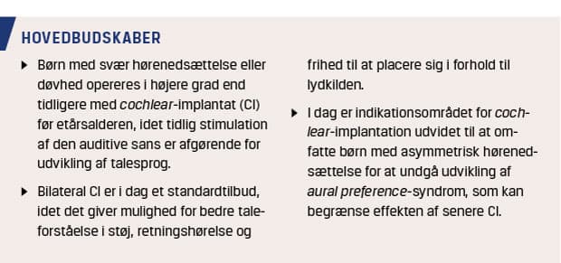 En række faktorer har væsentlig betydning for udbyttet af CI, herunder patientkarakteristika, familieforhold og postoperativ rehabilitering. Alderen ved implantation er vigtig, idet dannelse af centrale auditive forbindelser kræver stimulation i den tidlige barndom. Således søger man i dag at implantere CI hos børn med kongenit døvhed før etårsalderen [15]. Hvor monaural CI tidligere var hyppigt anvendt, er bilateral CI i dag et standardtilbud. Bilateral CI giver mulighed for at høste fordelene ved binaural hørelse i form af bedre taleforståelse i støj, retningshørelse og frihed til at placere sig i forhold til lydkilden [20]. Barnets forældre har afgørende betydning for udbyttet ved CI, idet sproglig kommunikationsform, støtte og involvering i forhold til opfølgning spiller positivt ind [2, 21]. Den postoperative audiologopædiske rehabilitering har central betydning for effekten af pædiatrisk CI. Rehabilitering afhænger af indsatser og tilgængelighed, hvilket illustreres, når man sammenligner resultater på tværs af Danmark [6, 22]. I danske såvel som udenlandske undersøgelser af det audiologiske, funktionelle og uddannelsesmæssige niveau hos implanterede børn har man en iboende tendens til at undervurdere effekten af CI, idet udviklingen overhaler (langtids-)forskningsresultaterne, som bygger på praksisser, der er forskellige fra den nuværende [23]. Høremæssigt udbytte og afledte gevinster ved CI kan således forventes at blive bedre i fremtiden.