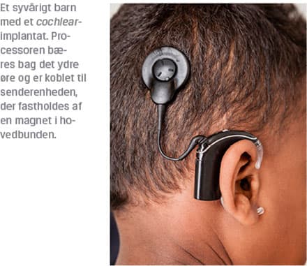 Permanent hørenedsættelse hos børn kan indtræde præ-, peri- eller postnatalt, og tilstanden kan være stationær eller progredierende. Mere end 50% af al medfødt hørenedsættelse har genetisk ætiologi, og af ikkegenetiske årsager dominerer føtal infektion med cytomegalovirus. Hørenedsættelse er beskrevet som et element i mere end 400 syndromer, og især Pendreds syndrom er i Danmark en relativt hyppig årsag til hørenedsættelse, der fører til CI-behandling af børn [3]. I en metaanalyse fra 2015 af ætiologi til hørenedsættelse hos børn fandt man, at de tre hyppigste ætiologiske diagnosekategorier var »ukendt« med en prævalens på 40%, »genetisk nonsyndromal« på 22% og »postnatal« på 11% [4]. Ca. 10% af permanente hørenedsættelser hos børn er af typen auditiv neuropati-spektrum, som er karakteriseret ved dyssynkroni af ledningen gennem hørenerven [5].