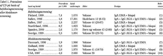 Prævalensen af CD er i flere udenlandske screeningsundersøgelser vurderet til at ligge mellem 1,9 og 8,2 per 1.000 indbyggere (Tabel 1 ). I de fleste undersøgelser anvendes en trinvis fremgangsmåde, hvor man først måler IgA- og IgG-gliadinantistof (AGA). På individer med et positivt resultat måles dernæst IgA endomysiumantistof (EMA), og endelig bekræftes diagnosen ved tyndtarmsbiopsi. Undersøgelserne viser samme prævalens hos børn i skolealderen og voksne. Hovedparten af de patienter, der diagnosticeres ved screening, er subkliniske.