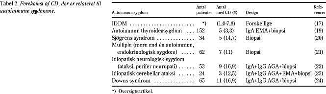 Flere udenlandske undersøgelser har vist, at patienter med type 1-diabetes (IDDM) har en 5-10 gange højere prævalens af CD end baggrundsbefolkningen (17). Resultater fra Fyn (18) tyder på, at der også i Danmark er en høj co-incidens mellem de to sygdomme, idet undersøgelse af 106 børn med IDDM påviste 11 tilfælde med CD. Patienter med CD har desuden øget forekomst af en række andre autoimmune og neurologiske sygdomme, hvoraf de vigtigste er: autoimmun thyroiditis, Sjögrens syndrom, mb. Addison, idiopatisk cerebellar ataksi og perifer neuropati. Der er nu publiceret flere screeningsundersøgelser, som viser, at patienter med de nævnte autoimmune tilstande har 5-50 gange øget risiko for subklinisk CD. Tilstedeværelse af mere end én autoimmun sygdom synes at øge risikoen for CD. Den høje prævalens blandt patienter med Downs syndrom skal ses i sammenhæng med, at dette syndrom er associeret med flere autoimmune sygdomme såsom hypotyroidisme og IDDM (Tabel 2 ).