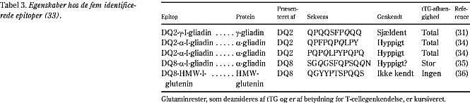 Efter påvisningen af gliadin som sygdomsudløsende protein, er der publiceret mange arbejder om, hvilke(n) struktur(er) i gliadin der udløser sygdommen. Resultaterne har været vanskelige at bedømme pga. en manglende dyresygdomsmodel og/eller manglende in vitro-assays. I 1993 åbnede isoleringen af gliadinspecifikke, HLA-restriktede T-cellekloner fra tyndtarmsmucosa fra patienter med CD (29) mulighed for udviklingen af en systematisk kortlægning af de sygdomsfremkaldende strukturer. Ved anvendelse af forskellige T-cellekloner og forskellige gliadinpræparationer, blev det vist, at der findes flere aktive gliadinepitoper (30). I 1998 blev strukturen af de første epitoper (31, 32) bestemt. Arbejde i vores laboratorium viste, at det native gliadin ikke i sig selv er særlig aktivt, men at en distinkt glutamin skal deamideres til glutaminsyre for at stimulere de isolerede T-cellekloner til proliferation (31). Der er efterfølgende påvist flere andre epitoper (Tabel 3 ).