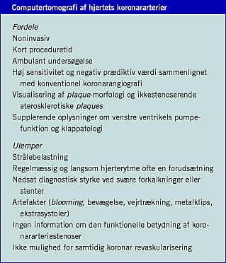 Computertomografi (CT) er en veletableret billedmodalitet på danske røntgenafdelinger og benyttes ved diagnostik inden for en lang række specialer. Efter introduktionen af den første multidetektor CT-skanner (MDCT) i 1998 er den teknologiske udvikling gået meget hurtig. Ved MDCT er flere detektorkæder placeret i patientens længdeakse, hvilket gør det muligt at danne flere billedskiver (slices) simultant. Dermed kan skanningen afvikles meget hurtigt og med meget tynde tomografiske snit. Betegnelsen MSCT (multislice-CT) og MDCT bruges synonymt i litteraturen. Computertomografi med henblik på visualisering af hjertets koronararterier vil i det følgende blive benævnt CT-KAG og være hovedfokus i denne oversigt.