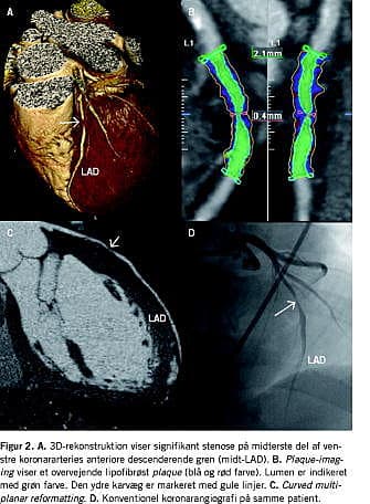 Ud over visualisering af det kontrastfyldte lumen giver CT-KAG også oplysninger om karvæggen og plaque -morfologien. Ikkestenoserende plaques og remodellering af karvæggen kan identificeres, ligesom eventuelle plaques kan karakteriseres som værende overvejende lipidholdige, fibrøse eller kacificerede (Figur 2). De kliniske implikationer af en sådan opdeling er dog fortsat uafklarede.