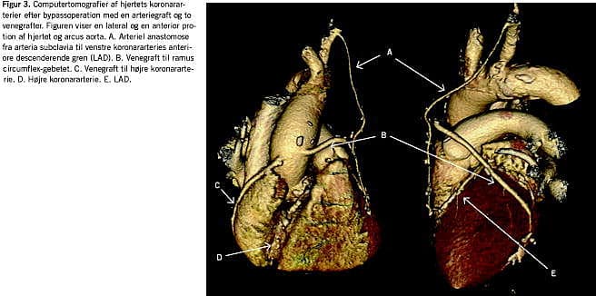 Tilsvarende problemer gør sig gældende ved tidligere bypassopererede patienter (metalklips, lille kardiameter ved anastomoserne og udbredte forkalkninger af de genuine kar). Nylige studier har dog også her vist en høj diagnostisk sikkerhed [10], og specielt ved problemstillinger, hvor det kun drejer sig om visualisering af bypassgrafter, vil metoden være velegnet (Figur 3).