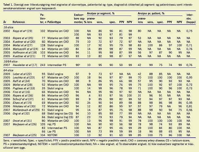 Der blev foretaget søgning på MEDLINE i perioden januar 2002 til januar 2008 med MeSH-søgeordene: computed tomography, coronary disease og coronary angiography. Studier, som omhandlede plaque -morforlogi, stenter, bypassgrafter, perfusion, hjerteklapper og pumpefunktion er udeladt. I alt 34 relevante engelsksprogede publikationer, der sammenligner CT-KAG med konventionel-KAG, blev fundet. Samtlige studier med 64-slice-CT og de otte største studier med 16-slice-CT er medtaget i denne oversigt. De nyeste oversigtsartikler på området er gennemgået for oversete studier, og tre metaanalyser blev identificeret [4, 13, 14]. Der var ingen relevante resultater ved søgning i Cochrane-databasen.