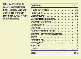 Medianalderen var 48 år (0-89 år). Dødsårsagerne fremgår af Tabel 1. I 14 tilfælde (9,3%) blev der ved CT stillet væsentlige diagnoser, som ikke blev fundet ved obduktionen. Det var fem ekstremitetsfrakturer, et bækkenbrud, tre knoglemetastaser, to pneumothorax og to tilfælde af væskeansamling i den ene lungehule med svær hjertekompression. I sidstnævnte tilfælde blev hydrothorax påvist ved obduktionen, men graden af midtlinjeforskydning blev ikke erkendt. Hertil kommer et tilfælde, hvor der ved obduktionen var mistanke om pneumothorax, hvilket kunne udelukkes ved CT. I 77 tilfælde (51,3%) blev der ved obduktionen stillet væsentlige diagnoser, som ikke blev fundet ved CT (Tabel 2). Dødsårsagen kunne fastslås ved CT i 45 tilfælde (30%), ved obduktion i 109 tilfælde (72,6%) og ved retskemisk undersøgelse for alkohol, narkotika og lægemidler i 32 tilfælde (21,3%). Spørgsmålet om, hvorvidt CT kunne have erstattet obduktionen, blev søgt besvaret to gange. Første gang umiddelbart efter CT og anden gang efter at resultatet af obduktionen og supplerende undersøgelser (f.eks. mikroskopi og retskemi) forelå. Ved dette - til dels subjektive - skøn blev resultaterne af CT og obduktion sat i relation til, i hvilken grad undersøgelsens formål blev opfyldt ved de to metoder. Ved den første vurdering blev det skønnet, at en obduktion kunne undværes i 57 tilfælde (38%), men ved den anden vurdering fandt man, at dette havde været forkert i to tilfælde, hvor henholdsvis en basisfraktur og en aortaruptur var blevet overset ved CT. CT var til størst nytte i de 23 tilfælde, hvor døden skyldtes svære traumer. I disse tilfælde blev det skønnet, at CT kunne erstatte en obduktion i 65% af tilfældene mod kun ved 19% af de 65 dødsfald, som skyldtes sygdom.
