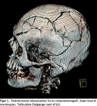 CT er en hurtig undersøgelsesmetode, som er ved at vinde indpas på de retsmedicinske institutter [2-4]. En rutineskanning tager ca. 10 minutter. Informationerne, som er i digital form, kan let lagres, sendes og kopieres. Herved sikres en bedre dokumentation og en bedre mulighed for revurdering af diagnoserne, for eksempel i Retslægerådet, hvilket må betragtes som en gevinst for retssikkerheden. CT-fotografier med f.eks. skudvinkler eller kraniefrakturer vil ofte være mere acceptable til fremvisning for nævninge i en retssag end traditionelle obduktionsfotografier. CT giver indblik i kroppens strukturer in situ, før de forstyrres ved obduktionen [5]. Det kan være en fordel ved kominutte kraniebrud, hvor brudstykkerne falder fra hinanden, når kraniet åbnes (Figur 1), eller til vurdering af graden af forskydning af midtlinjestrukturer (mediastinum og hjerneventrikler). CT giver desuden indblik i områder, som ikke undersøges rutinemæssigt, eller som er vanskeligt tilgængelige, og er velegnet til påvisning af fremmedlegemer (body packers med narkotikaposer i mave-tarm-kanalen) eller luft (luftemboli og pneumothorax) [6, 7]. Postmortel udvikling af forrådnelsesgas kan dog umuliggøre påvisningen af luftemboli. CT kan være til hjælp, når dødfundne skal identificeres, både i enkeltsager og ved massekatastrofer (flystyrt og togkatastrofer) [8-12]. Med CT kan man hurtigt afsløre hofteproteser, kunstige hjerteklapper, gamle knoglebrud eller andet af værdi for identifikationen.