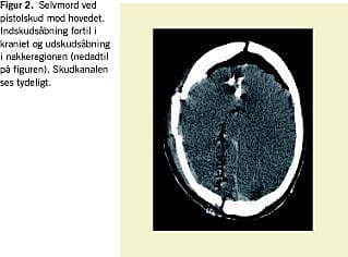 Der var en enkelt skudsag (enkeltprojektillæsion, selvmord), hvor CT blev anvendt til at lokalisere projektilet og illustrere skudbanen.