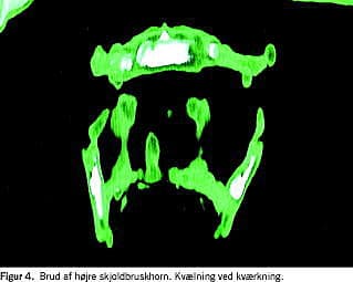 Ved obduktion af trafikdræbte er CT en stor hjælp [19]. Forskellige ulykkestyper har hver deres karakteristiske læsionsmønster, som kan fortælle meget om traumemekanismen. Fodgængere, som rammes af en bil, kan få et karakteristisk skinnebensbrud med et trekantet intermediær fragment, hvis spids peger i traumeretningen (Figur 3). CT er også velegnet til undersøgelse af voldsofre (Figur 4), herunder børn hos hvem forekomst af knoglebrud af forskellig alder tyder på gentagne voldsepisoder.