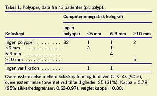 Resultater: I alt 480 patienter blev henvist til koloskopi, 50 koloskopier (10%) var inkomplette. Femogtyve patienter fik udført CTK samme dag, resten senere pga. manglende computertomografikapacitet. Hos 12 patienter (24%) havde man mistanke om polypper (ni) eller tumorer (tre) oralt for de primært undersøgte afsnit, og to (4%) havde polypper, der var overset ved koloskopien. Tretten af 17 formodede polypper blev verificeret, mens to af tre tumorer var karcinomer. Der var overensstemmelse mellem fundet ved CTK og koloskopifund mht. polypstørrelse i 90% af tilfældene (kappa 0,79) og mht. lokalisation i 88% af tilfældene (kappa 0,83). Uventede ekstraintestinale fund forekom hos 19 patienter (38%), heraf havde fire maligne tilstande, og en havde et syv centimeter stort aortaaneurisme. Hos 96% af dem, der blev undersøgt samme dag, var udrensningen også ved CTK komplet.