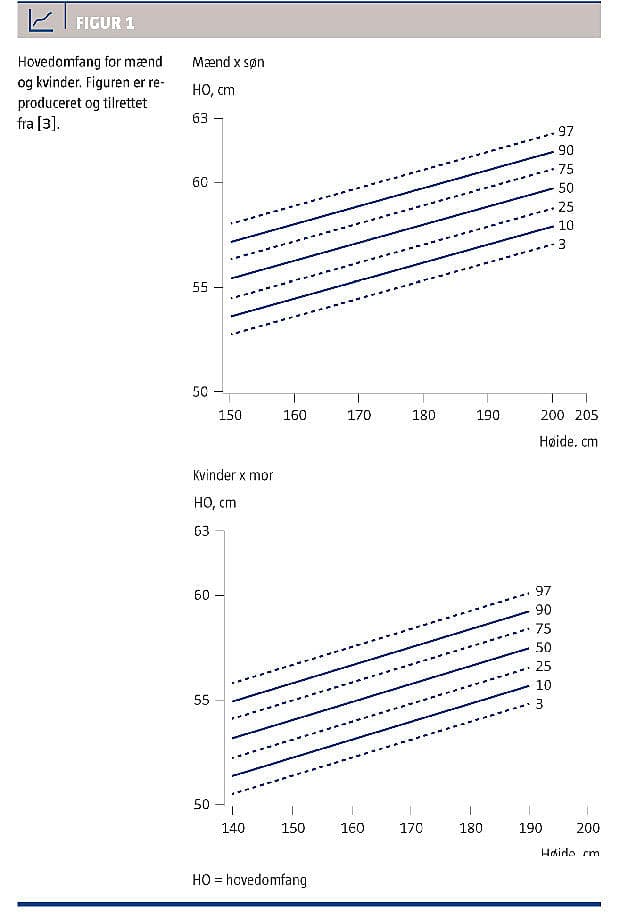 Patientens 23-årige søn blev efterfølgende undersøgt og havde makrocefali med et hovedomfang på 66 cm (> 97-percentilen ved en højde på 181 cm), struma, hæmangiomer og PPH. Han havde aldrig tidligere søgt læge for nogen af disse symptomer. Patienternes hovedomfang er vist i Figur 2.