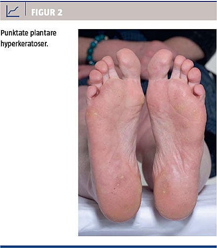 En dansk kvinde, der var født i 1962, blev henvist til genetisk rådgivning pga. punktate palmoplantare hyperkeratoser (PPH) (Figur 1) og mistanke om mulig sammenhæng med ophobning af cancertilfælde (øsofaguscancer, coloncancer og cervixcancer) i hendes familie. Hun var gennem flere år søgt behandlet for refraktære vorter på hænder og fødder. Det blev oplyst, at hun et år gammel var blevet henvist til udredning pga. makrocefali og fik foretaget kraniotomi herfor. Siden 25-årsalderen havde hun fået excideret 18 intumescenser på hud og slimhinder, bl.a. verruca vulgaris, callus, keratosis punctata, hæmangiom, papillom, neurom, fibrom i kindslimhinde, reaktiv hyperkeratose på tungeranden og adenom i tarmen. Da hun var 27 år, fik hun struma og blev senere partielt strumektomeret. Da hun var 42 år, blev hun bilateralt mastektomeret pga. af bilateralt duktalt carcinoma in situ.
