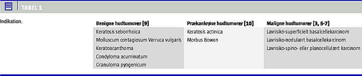 Curettage kan anvendes til en lang række benigne, præmaligne og maligne epidermale hudtumorer (Tabel 1 ).
