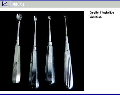 Curette/skarpske: Curetten findes i forskellige størrelser og kan være udformet som en ring eller en ske (Figur 1 ). I handlen findes både curetter til engangsbrug og flergangsbrug. Curetten til engangsbrug er knivskarp og kan være vanskeligere at anvende til curettage, idet det er vanskeligt at fornemme forskellen mellem tumorvæv og normalt væv.