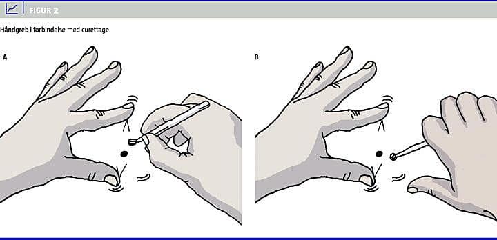 Ved behandling af benigne tumorer opnås under proceduren en fornemmelse af adskillelse af tumoren fra det underliggende væv (Figur 3 ). Man bør undgå for dyb curettage af hensyn til det kosmetiske resultat. En curette til flergangsbrug kan med fordel anvendes, idet engangscuretten er meget skarp og giver risiko for dyb curettage uden fornemmelse af elementets afgrænsning.