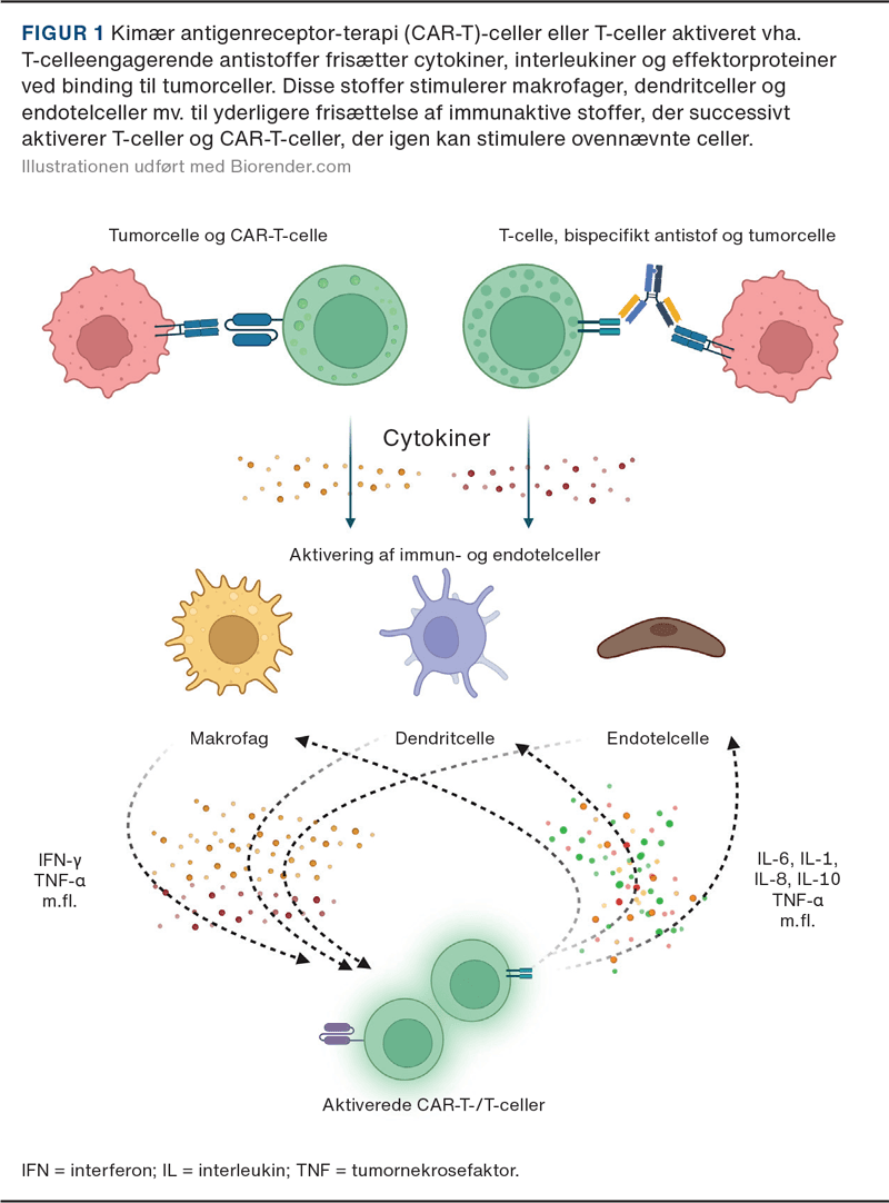 CRS er en suprafysiologisk, immunologisk tilstand, som kan udløses ved behandling med CAR-T og TCE, men CRS kan også optræde ved infektioner og autoimmune tilstande. Tidlig erkendelse af tilstanden og hurtig initiering af understøttende behandling med ilt, væske, immunmodulerende behandling og evt. intensiv terapi er essentiel for et optimalt behandlingsresultat. IL-6R-antagonisten tocilizumab og evt. glukokortikoid vil ofte være den foretrukne immunmodulerende førstelinjebehandling.