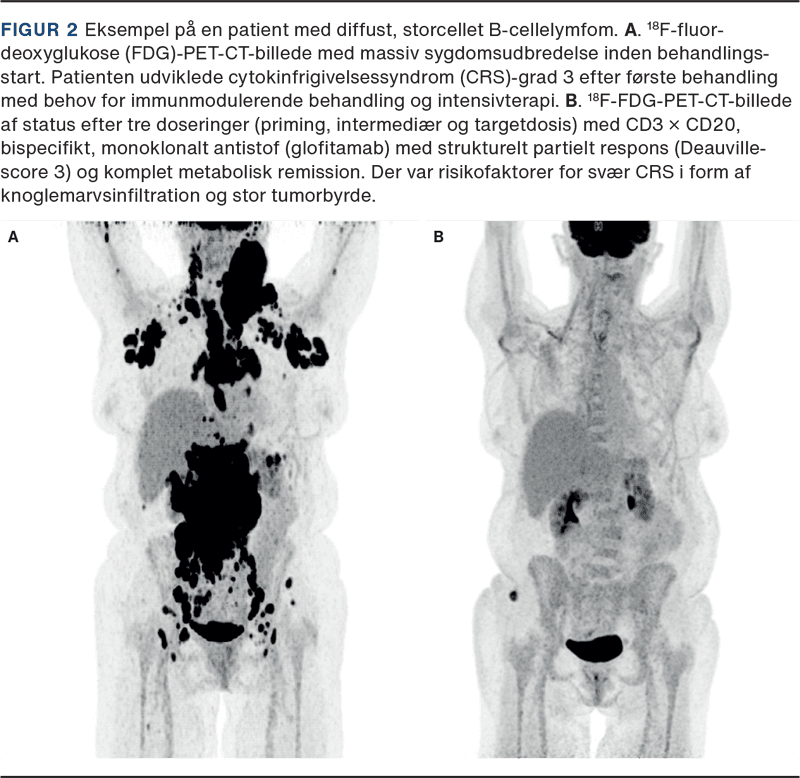 Figur 2 viser et eksempel på en ældre patient med udbredt, diffust, storcellet B-cellelymfom før og efter behandling med TCE. Patienten udviklede dag et – allerede to og en halv time efter behandling med startdosis glofitamab (TCE) – feber og takykardi og blev givet første dosis tocilizumab. I dette døgn havde patienten fortsat feber og hypotension på trods af gentagne tocilizumab- og dexamethasonbehandlinger. Patienten blev overflyttet til intensivafdeling med CRS-grad 3 til behandling med noninvasiv ventilation, vasopressorstoffer og monitorering. Patienten stabiliseredes og kunne planmæssigt modtage intermediær dosis glofitamab på ottendedagen, som var veltolereret med beskedne bivirkninger i form af CRS-grad 1, hvilket illustrerer den øgede risiko for CRS ved de(n) først(e) dosering(er).