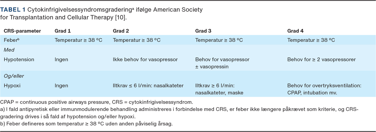 Feber er et kardinalsymptom ved CRS, og sværhedsgraden af tilstanden vurderes ud fra simple, kliniske parametre (Tabel 1). CRS inddeles i fire grader baseret på tilstedeværelse af feber og sværhedsgrad af hypotension og hypoxi [10]. CRS er hyppigt forekommende ved TCE-/CAR-T-behandling. I en metaanalyse vedrørende myelomatose observeredes CRS hos 87% af de CAR-T-behandlede (6% med grad ≥ 3) mod 67% af de TCE-behandlede (0,2% med grad ≥ 3) [16]. Lignende CRS-forekomster er set ved TCE-behandling af lymfom med CRS hos 50% (3,5% med grad ≥ 3) [2], og for leukæmi er observeret CRS-grad 3-4 hos 46% ved CAR-T-behandling [17]. CRS-grad 1 er ofte forbigående og selvlimiterende, mens alvorligere tilfælde kan medføre hypoperfusion, hypoxi, inflammation og subsidiært lede til multiorgansvigt og kræve intensiv behandling.