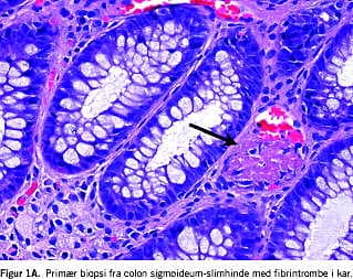Objektivt var patienten alment upåvirket, temperaturen 38,3 °C og abdomen fandtes let meteoristisk. Blodprøver viste let forhøjet C-reaktivt protein 38 mg/l, alanin-aminotransferase (ALAT) 73 E/l og basisk fosfatase 130 E/l. Øvrige blodprøver, urinstiks og røntgen af thorax var normale. Ultralydsskanning af abdomen viste let splenomegali. Sigmoideoskopi viste distalt i rectum et inflammeret, ulcereret område makroskopisk suspekt for morbus Crohn eller analcancer. Histologisk sås imidlertid fibrintromber i karrene i både sigmoideum og rectum, se Figur 1A og i rectum sås endvidere ulceration med beskeden uspecifk inflammation.