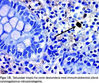 Ileokoloskopi 3uger senere viste venstresidige segmentære slimhindeforandringer med ophævet kartegning, ødem og hyperæmi samt spredte after. I rectum sås de tidligere beskrevne ulcerative forandringer under opheling. Biopsier viste let uspecifk inflammation og ulcus samt CMV-inklusionslegemer, se Figur 1B.