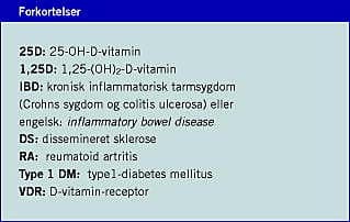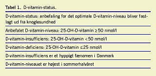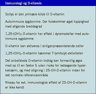 D-vitamins rolle i regulering af knogle- og kalkmetabolismen er velkarakteriseret, og der er i dag konsensus om, at D-vitamin-insufficiens forekommer hyppigt i normalbefolkningen (Tabel 1 ) [1]. I de senere år har der været opmærksomhed på D-vitamins mulige nonkalcæmiske effekter, herunder en direkte påvirkning af immunsystemet. Med baggrund i epidemiologiske, dyreeksperimentelle og cellulære in vitro-studier har D-vitamin-insufficiens været foreslået som en bidragende ætiologisk faktor ved autoimmune sygdomme.