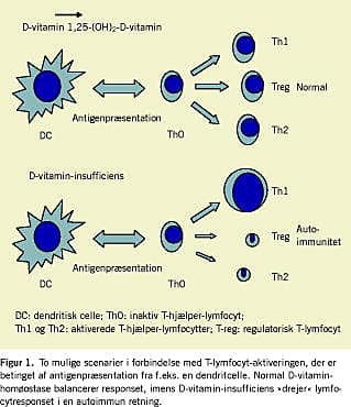 D-vitamin har en effekt på T-lymfocytternes aktivitet, idet det proinflammatoriske respons hæmmes, og det antiinflammatoriske respons fre mmes. Øget produktion af TNF-α er et fremtrædende træk ved RA og IBD, og blokering af TNF-α -signalering (infliximab) er i dag en implementeret behandling ved disse tilstande. Den aktive form af D-vitamin - 1,25D - hæmmer produktionen af TNF-α [7]. Stimuleres T-lymfocytter med 1,25D, nedreguleres IFN-γ -produktionen samtidig med en nedregulering af IL-2, et cytokin, der fremmer T-lymfocyt-aktiveringen via et autokrint positivt feedbacksystem [8]. I nærkontakt med dendritiske celler og 1,25D udviser T-lymfocytter regulatorisk potentiale, og nettoeffekten er en opregulering af IL-10 og en nedregulering af INF-γ [6]. Samtidig kan 1,25D ændre T-lymfocyt-cytokinproduktionen fra en Th1-retning til en Th2-retning, hvor en nettoeffekt teoretisk kunne være en hæmning af autoinflammation (Figur 1) [9].