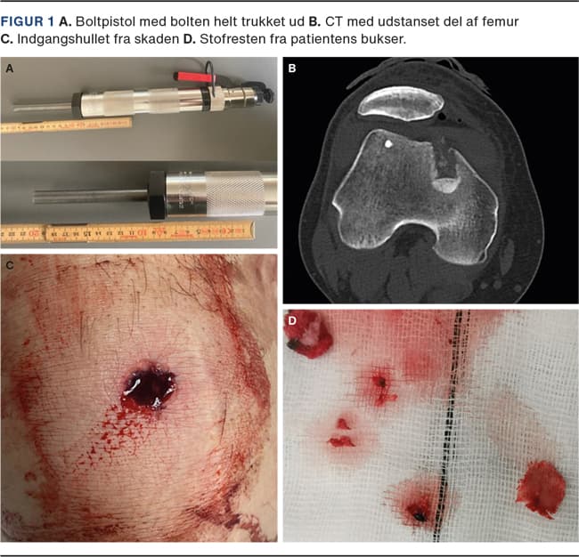 I forbindelse med aflivning af smågrise ramte patienten, der var en 54-årig fuldtidslandmand, sig selv i højre ben lige over knæet med en boltpistol. Han tog til sin praktiserende læge, der vurderede, at der skulle primært sutureres, og der blev indledt antibiotikabehandling. Efterfølgende tilkom der yderligere smerter samt blødning fra såret, hvorfor patienten blev modtaget i skadestuen samme dag. I bukserne havde han ydermere opdaget et udstanset hul, der ikke kunne redegøres for, og man havde mistanke om, at der kunne være en dybere intralæsionel skade. En CT viste en kompressionskanal ind i distale femur (Figur 1B) kranielt og medialt for patella og intraartikulært svarende til den suprapatellare reces.