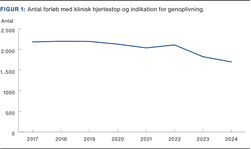 I 2024 blev der indberettet i alt 1.905 forløb med klinisk hjertestop på hospital i Danmark, heraf 1.697 med indikation for genoplivning. Det er et betydeligt fald i forhold til de foregående år, hvor der i 2023 og 2022 blev indberettet henholdsvis 1.824 og 2.109 forløb med klinisk hjertestop og indikation for genoplivning (Figur 1). Det er positivt, at antallet af hjertestop på de danske hospitaler er faldet over tid. Årsagen er formodentlig multifaktoriel og relaterer sig til både den samlede hospitalsaktivitet og kvaliteten af behandling på sygehusene samt til anvendelsen af systematisk stillingtagen til indikation for genoplivning. Disse forhold belyses ikke direkte med årsrapportens indikatorer