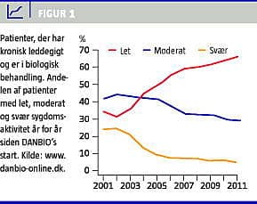 Den systematiske overvågning har bidraget til, at kvaliteten i behandlingen er steget år for år (Figur 1 ). Andelen af patienter med svær sygdomsaktivitet er faldet til 5%, mens andelen af patienter med let sygdomsaktivitet er steget fra 35% til 66%.