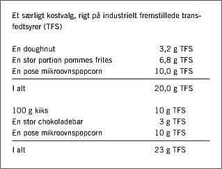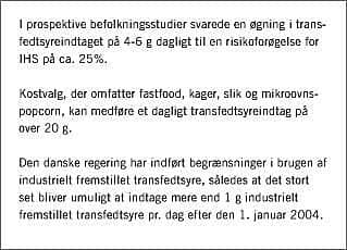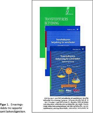 Efter at have konsulteret medlemsstaterne i EU har den danske regering i marts 2003 besluttet, at olier og fedt til konsum med et indhold af mere end 2 g industrielt fremstillet transfedtsyre (TFS) pr. 100 g ikke må sælges i Danmark fra den 1. januar 2004 [1]. Den faglige baggrund for det danske initiativ er beskrevet i tre rapporter fra Ernæringsrådet (Figur 1 ) [2- 4].