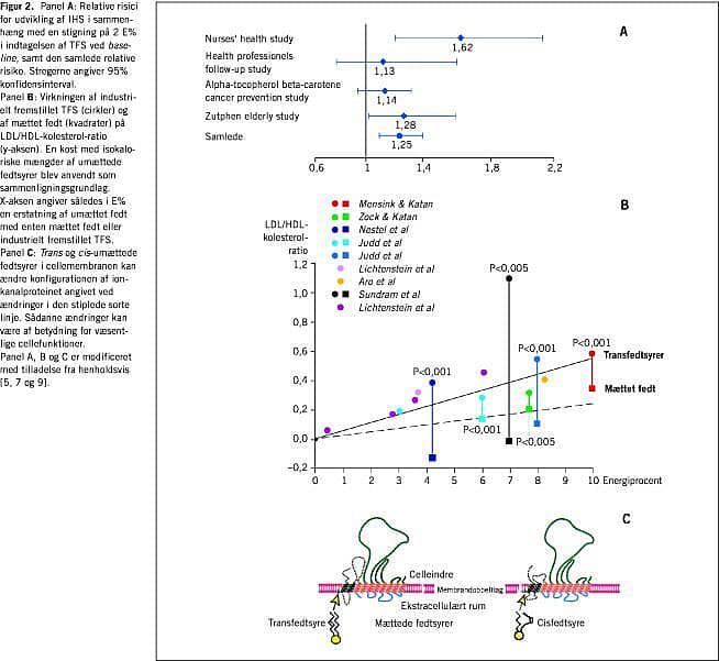 Igennem de seneste ti år er der kommet holdepunkter for, at industrielt fremstillet TFS fremmer udviklingen af iskæmisk hjertesygdom (IHS). Mest afgørende er fire store observationelle undersøgelser, der tilsammen omfatter 145.000 kvinder og mænd observeret i 6-16 år, europæere såvel som amerikanere (Figur 2 A). Det samlede resultat af disse fire undersøgelser giver en relativ risiko for IHS på 1,25 sammenfaldende med en øgning i transfedtsyreindtaget på 2 energiprocent (E%), der igen svarer til ca. 5 g TFS pr. dag hos en voksen person [5]. En amerikansk rapport har for nylig anbefalet, at indtaget af TFS begrænses så meget som muligt på grund af risikoen for IHS [6].