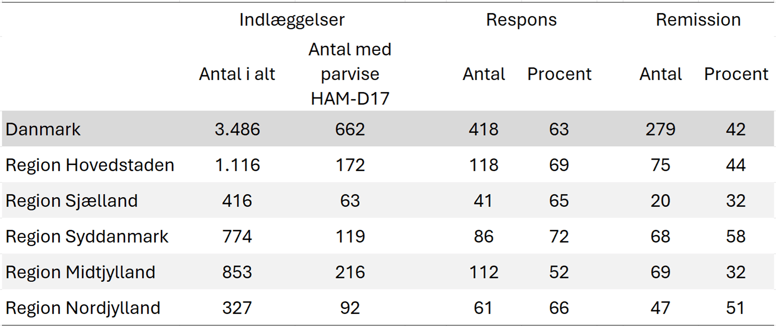 Som noget nyt i årsrapport 2024 har vi udvidet med beregninger af behandlingsrespons (andel af patienter, der under indlæggelsen har opnået en forbedring i score på mere end 50 %) og remission (andel af patienter, der har en HAM-D17-score på 7 eller derunder ved udskrivelse). Disse resultatmål viser gode resultater idet 63 % af indlagte patienter opnår behandlingsrespons, mens 42 % opnår remission.
