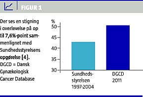 Historisk set har ovariecancerpatienter i Danmark haft den dårligste overlevelse blandt de nordiske lande [3]. DGCD kan dokumentere, at overlevelsen er steget med ca. 8% (Figur 1 ).