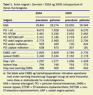 I 2004 og 2005 fik i alt 37.823 patienter udført en eller flere KAG, som blev indrapporteret til DHR. I samme periode fik 21.069 patienter foretaget mindst en revaskulariserende behandling (enten PCI eller CABG eller begge dele), svarende til 55,7% af de patienter, der var blevet undersøgt med KAG. Tabel 1 viser aktiviteten i 2004 og 2005 og dokumenterer en betydelig stigning i antal KAG, PCI og hjerteklapoperationer. En mindre del af stigningen i den registrede KAG-aktivitet skyldes, at Herning Sygehus og Hjertecenter Varde først startede indberetning til DHR i 2005. Der ses et mindre fald i antallet af CABG, formentlig som følge af den øgede PCI-aktivitet. Tabellen viser desuden antallet af PCI opdelt efter indikation. Stigningen i antallet PCI er inden for alle indikationer, men mest for stabil angina pectoris og NSTEMI/UAP, om end noget af stigningen kan skyldes fald i antallet med uoplyst indikation.