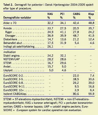 Tabel 2 viser patientsammensætningen i de fire procedurekategorier. Andelen på 70 år og derover er væsentlig højere blandt CABG-patienterne end blandt KAG- og PCI-patienterne, da det typisk er de ældste patienter med mest udtalt koronarsklerose, der behandles med CABG.