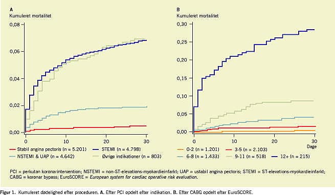 Resultater: Dødeligheden i de første 30 dage efter PCI var 3,2% og afhang af indikationen for PCI: ST-elevations-myokardieinfarkt (STEMI) 6,8%; non-STEMI og ustabil angina pectoris 1,9% og stabil angina pectoris 0,5%. Der var ikke signifkant forskel på overlevelsen mellem centrene efter primær PCI på indikationen STEMI, p = 0,30. Dødeligheden i de første 30 dage efter isoleret CABG var 2,6% og var klart relateret til patientens European System for Cardiac Operative Risk Evaluation (EuroSCORE). Der var ikke signifikant forskel på overlevelsen mellem centrene efter isoleret CABG, p = 0,12.