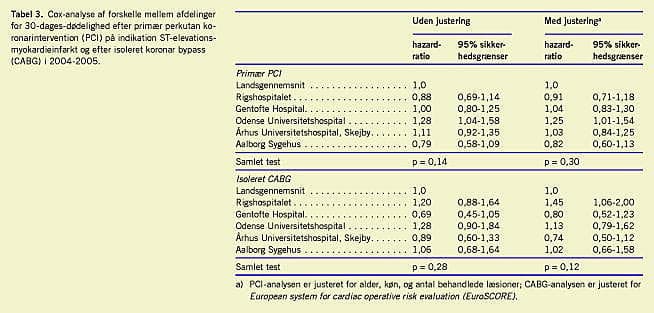 Resultatet af Cox-analyserne vedrørende evt. forskelle mellem centrene i 30-dages-dødeligheden efter primær PCI og isoleret CABG er angivet i Tabel 3 . For primær PCI viste det samlede test af den multivariate analyse, at der ikke var forskel i dødeligheden mellem de fem centre (p = 0,30), men Odense Universitetshospital lå statistisk signifikant over landsgennemsnittet, hazard ratio: 1,25 (95% konfidensinterval: 1,01-1,54; p = 0,04).