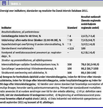Intensiv terapi omfatter behandling af patienter med potentielt reversible organsvigt af en sådan sværhedsgrad, at behandlingen ikke kan gennemføres på en almindelig sengeafdeling. Behandlingen har høje omkostninger, alvorlig prognose og et væsentligt potentiale for forbedringer [1, 2]. Dansk Intensiv Database (DID) blev etableret i 2007 [3]. DID indeholder p.t. otte kvalitetsindikatorer (Tabel 1 ), som ligger tæt op ad europæiske anbefalinger [4].