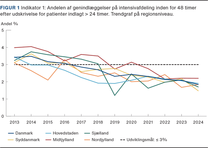 I 2024 blev 25.496 intensivindlæggelser registreret i Dansk Intensiv Database. Det er et lille fald sammenlignet med året før. Et centralt kvalitetsmål – genindlæggelser på intensivafdelinger inden for 48 timer – viser en positiv udvikling: På landsplan ses et fald til 1,8 % for patienter indlagt over 24 timer, ned fra 2,1 % året før. Det nationale udviklingsmål på ≤ 3 % er dermed opfyldt i alle regioner og størstedelen af afdelingerne. Figur 1 illustrerer i øvrigt, hvordan en løbende indsat over flere år, har ført til reduceret andel af genindlæggelser, og reduceret regional variation.