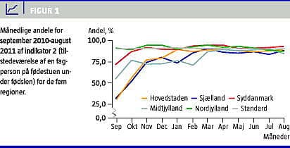 Resultaterne fra første årsrapport viser, at der specielt for indikatorer med nye registreringer var klinisk betydningsfulde forskelle mellem regionerne og mellem afdelingerne. Det er for tidligt at vurdere, om disse forskelle skyldes reelle kliniske forskelle eller opstartsfasen med nye registreringer. For de samme indikatorer gælder også, at resultaterne de fleste steder var langt fra de vedtagne standarder. Figur 1 viser resultatet for den indikator, der omhandler tilstedeværelse af en fagperson på fødestuen under fødslen.