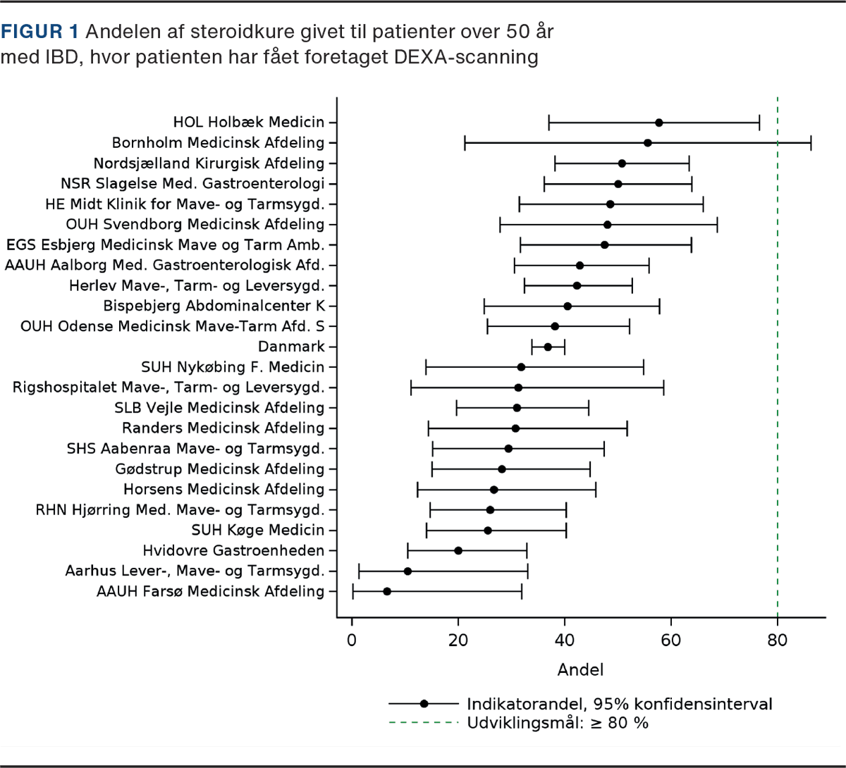 Særligt for indikatoren, der monitorerer opfølgning med DEXA-scanning for patienter med IBD over 50 år, der har været i behandling med steroid i 3 måneder, er der plads til forbedring. På landsplan har 37 % fået foretaget en DEXA-scanning med en regional variation fra 31 % til 41 %. Indikatoren viser med al tydelighed, at der ikke sker en systematisk opfølgning med DEXA-scanning i tilstrækkeligt omfang, når denne behandling sættes i værk. Styregruppen har netop prioriteret dette område til monitorering, da behandling med steroid er en hyppigt anvendt behandlingsmodalitet til at bremse en akut opstået betændelsestilstand i tarmen.